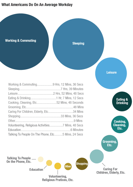 In thinking about how I work, I found that I work, on average 4.5 hour a day. That gives me almost 5 hours more a day than this survey indicates. My husband has about 1.5 hours a day just in travel time. My commute is 30 seconds! One of the things that concerned me about this survey is that it found 9-1/4 hours a day of work/commute, and only 34 minutes of caring for loved ones. If for no other reason, I appreciate working at home because it has allowed me to spend quality time with my family WHILE allowing me to have a business and contribute to the family finances.